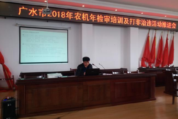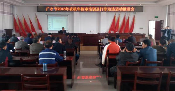 为响应省农机局“百万机手大培训、百万农机大检修、百万农机闹春耕”洪湖会议的号召, 3月28日随州市农机局、广水市农机局在陈巷镇召开了“2018年农机年检审培训及打非治违活动推进会”,近100名机手参加会议并接受培训。