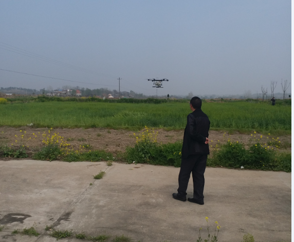 技术人员还演示了无人机植保作业。手柄一按,无人机腾地而起,来往于田间,均匀喷洒着农药。