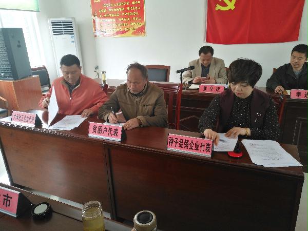 会上,随州市广舜种业作为种子经销企业代表对免费提供的优质稻种品质作了保证,对技术服务作了承诺,新华米业代表稻米加工企业承诺对贫困户种植的优质稻加价收购,两家企业分别与贫困户代表和种田大户签订了免费供种协议和订单加价收购合同。